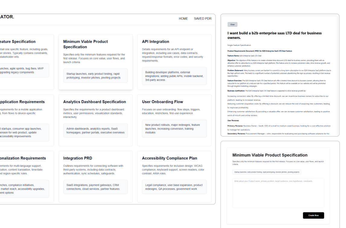 Create professional Product Requirement Documents. No more starting from scratch—PDR Creator handles the heavy lifting so you can focus on building great products.